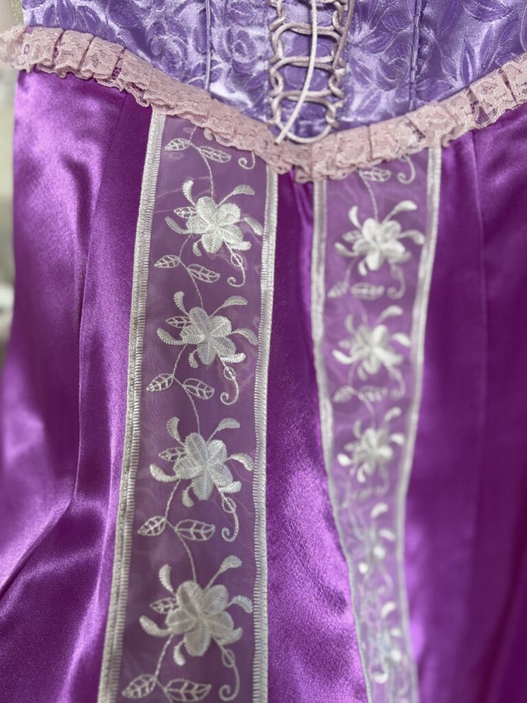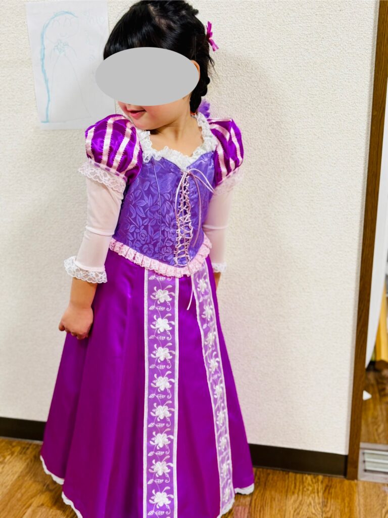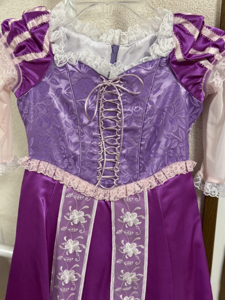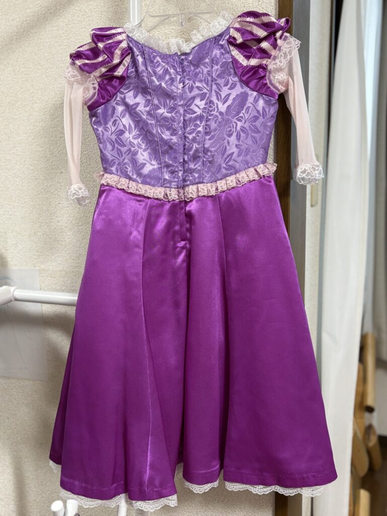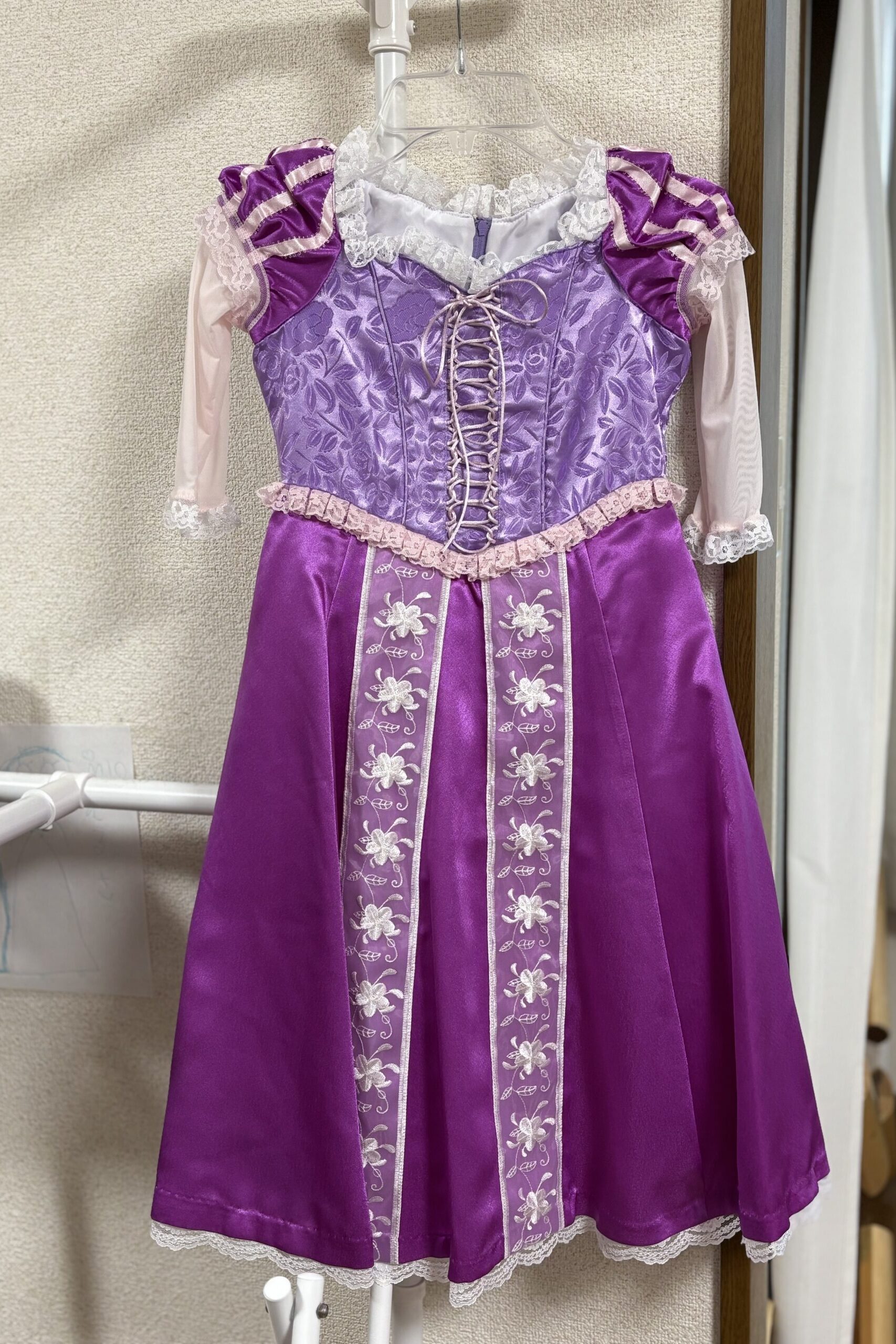 ラプンツェルドレスは薄手の長袖がついているので、インナーに長袖肌着や防寒着を着るのは難しく、胸元も広めのデザインなので、ピッタリサイズがおすすめ!