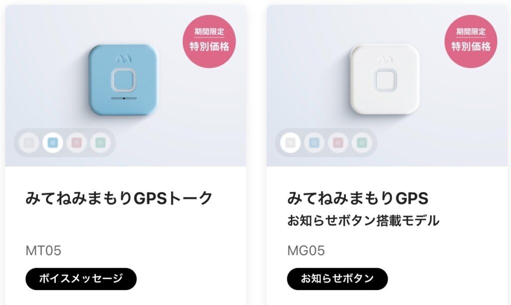 | みてねみまもり GPSトーク(MT05) | みてねみまもり GPSお知らせボタン搭載モデル(MG05) | |